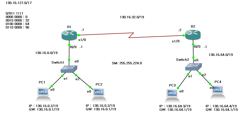 주어진 네트워크는 130.16.0.0/17이므로 세번째 옥텟만 이진법으로 표현하면 0000 0000, 0010 0000, 0100 0000, 0110 0000으로 나눌 수 있다. 다시 십진법으로 네트워크 ID를 표현하면 130.16.0.0, 130.16.32.0, 130.16.64.0, 130.16.96.0으로 표현 할 수 있다. 이때의 prifix는 두개의 비트가 늘어났으므로 19이며 서브넷 마스크는 255.255.224.0이다.