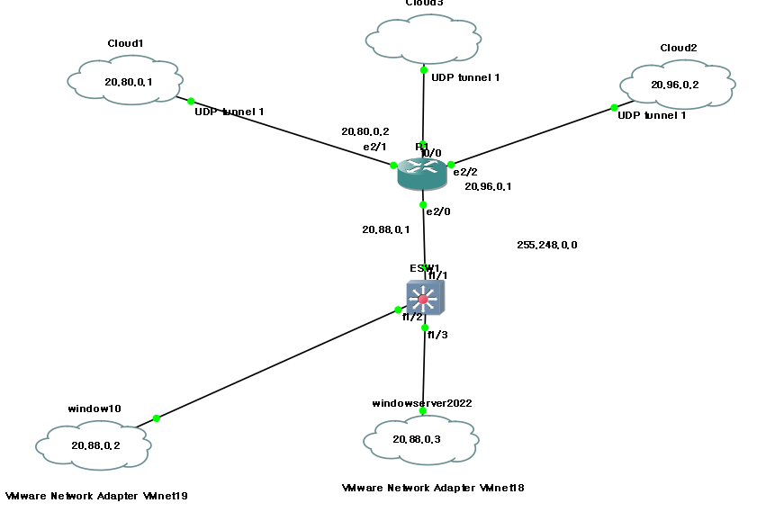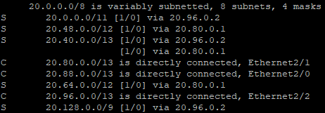 위의 환경에서 R1라우터의 경우 20.0.0.0/13부터 20.96.0.0/13까지, 외부 네트워크로 나가는 NI가 라우팅 테이블에 등록되어야 한다.
