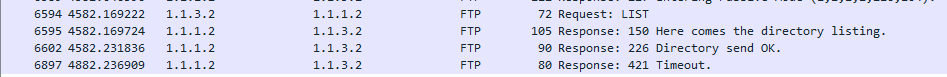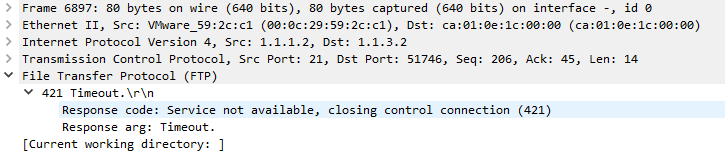 만약 일정시간동안 FTP조작을 하지 않게 되면 서버는 연결을 끊게되고 Timeout패킷을 전송하게 된다.