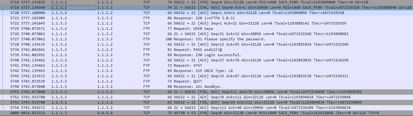 FTP를 접속 한 뒤에 패킷 흐름을 보면 SYN-> SYN/ACK -> ACK의 3way handshake가 이루어지는 것을 볼 수 있다.