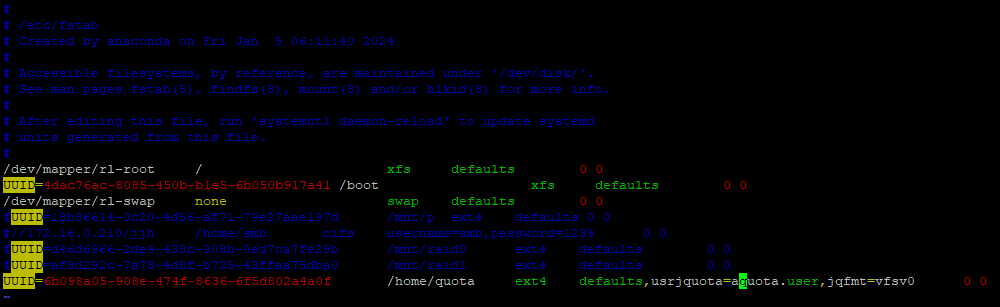 usrjquota = aquota.user, jqfmt = vfsv0 : ext4 파일 시스템에서 사용자 쿼터를 설정