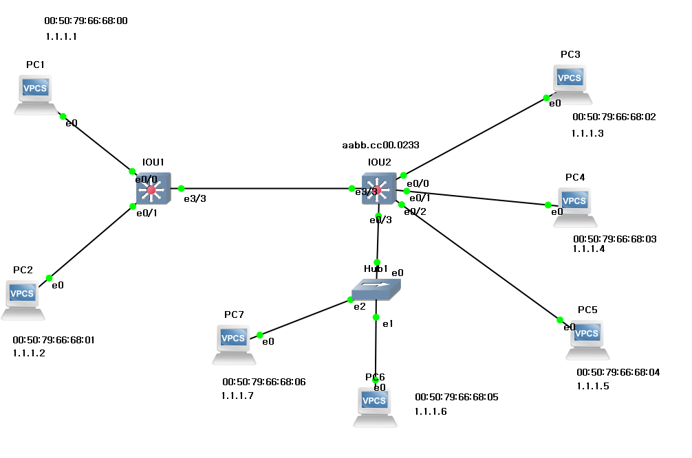 IOU2에서 e0/3에서 pc6은 Port-Secrity를 등록하고 7은 등록하지 않음