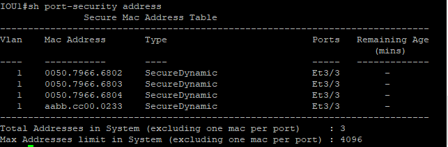 MAC 테이블을 확인하면 ping을 칠 수 있는 e3/3측 호스트는 4개이나 라우터또한 MAC주소를 가지기에 라우터가 포함된 5개의 주소가 등록된 것을 확인 가능하다. 즉, 스위치/라우터 또한 Port-Secrity적용 대상임을 유의해야한다.