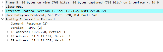 R2에서 R1으로 전송되는 RIP 패킷을 보면 11.1.11.1/24 네트워크에 대한 라우팅 경로가 전달되지 않는것을 볼 수 있다.