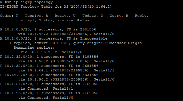 이 상황에서 R3 eigrp topology를 보면 다음과같다