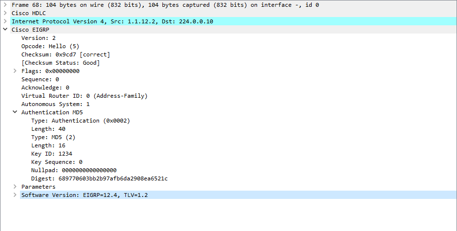 위 랩에서 R1과 R2 eigrp를 md5로 암호화 할 경우 Hello 패킷은 다음과 같다