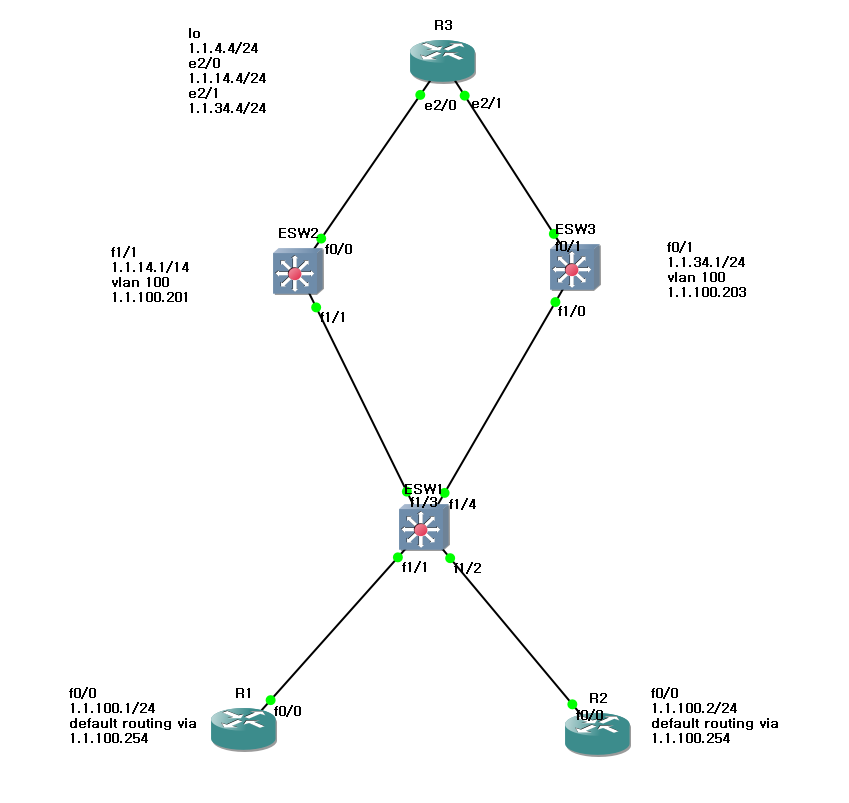 - R1, R2 default routing via를 1.1.100.254로 설정