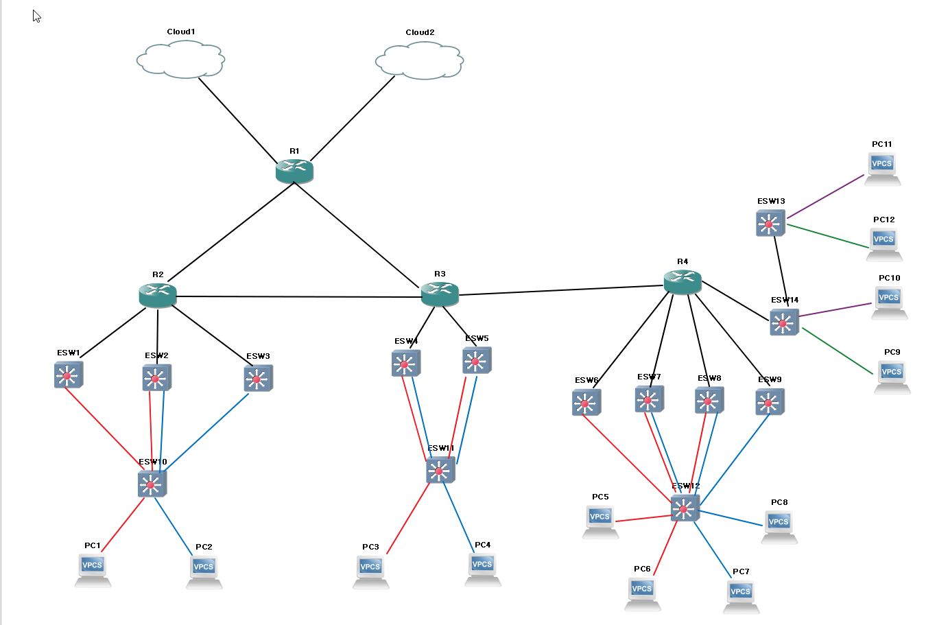 - 빨강 : vlan 10, 파랑 : vlan 20, 초록 : vlan 30, 보라 : vlan 40