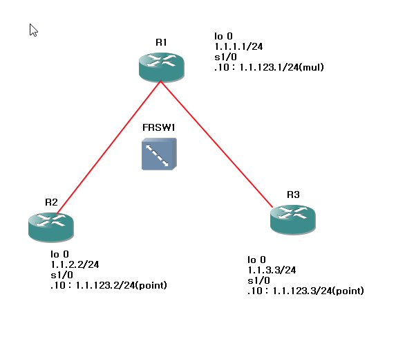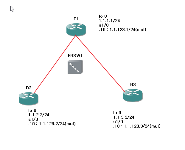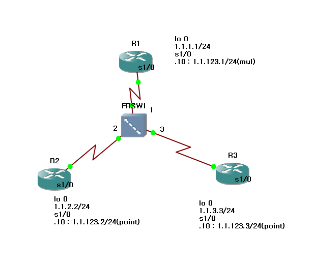 - R1 frame relay 가상 포트는 multipoint 형식으로 설정, R2~3는 Point to point 형식으로 설정